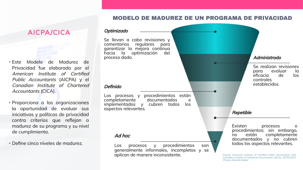 Una forma de medir la sofisticación o desarrollo general de un programa de privacidad de una organización es determinando su nivel de madurez. Inicialmente desarrollado por el Instituto Americano de Contadores Públicos Certificados (American Institute of Certified Public Accountants - AICPA) y el Instituto Canadiense de Contadores Públicos (Canadian Institute of Chartered Accountants - CICA), el Modelo de Madurez de Privacidad (“Modelo” o “MMP”) ha ganado una amplia aceptación como un medio para medir el nivel de desarrollo e implementación de un Programa de Privacidad.